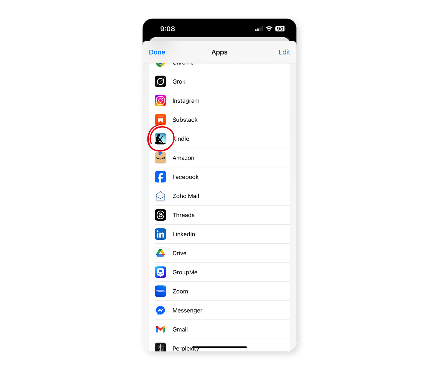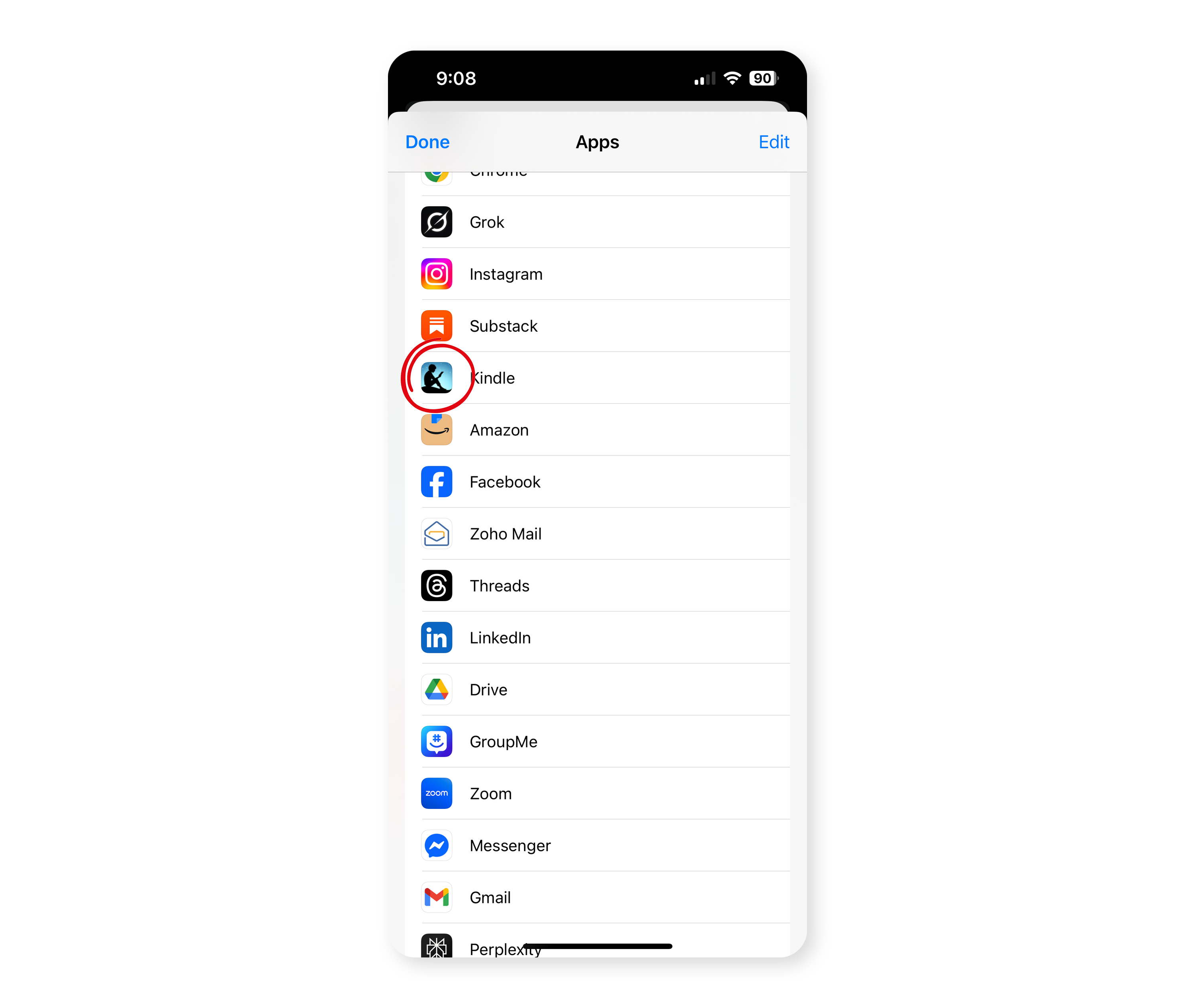 Navigate to the Kindle app on your phone and select it. If you don’t have the Kindle app, download it, install it, login, and then go back to Step 1.