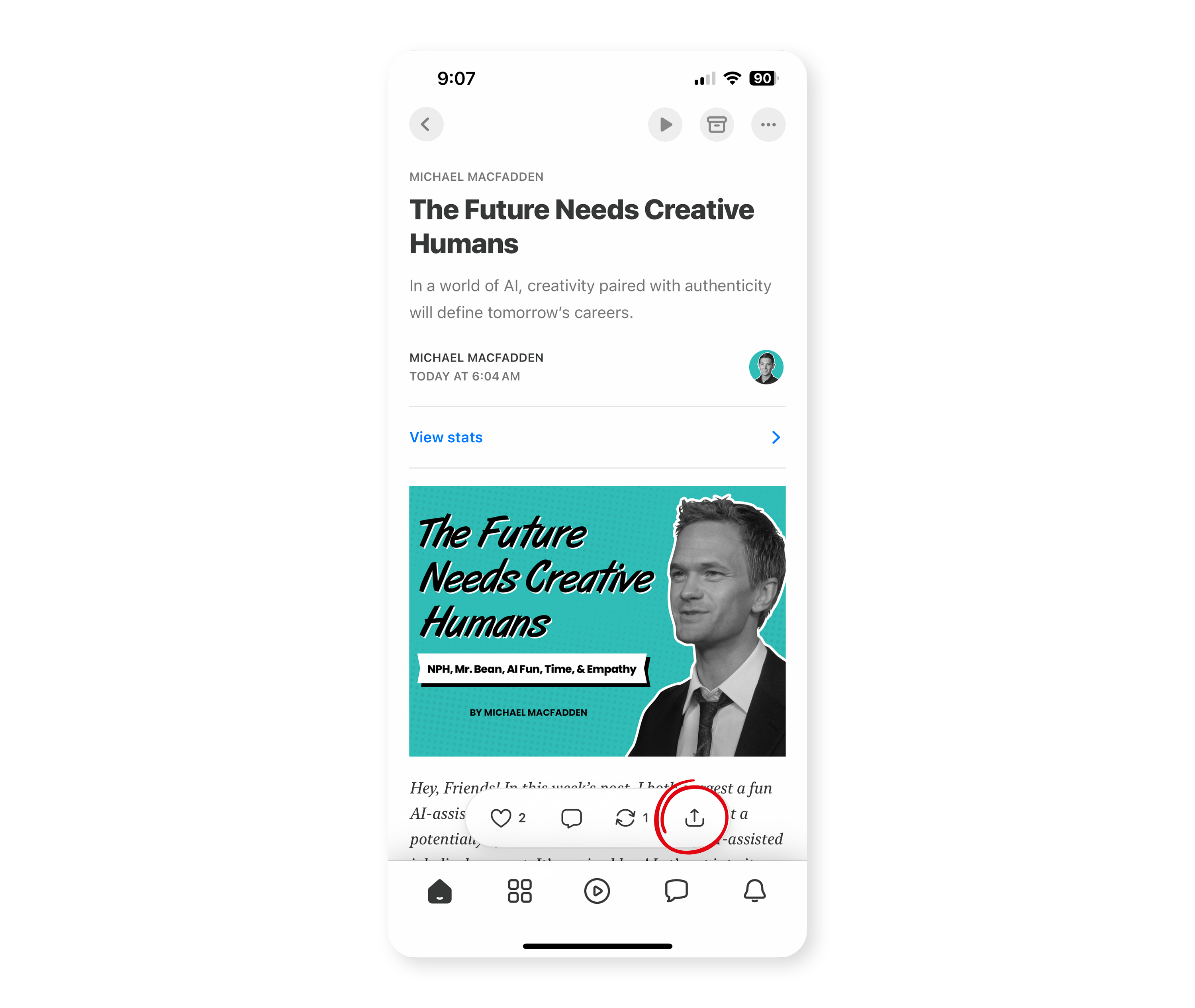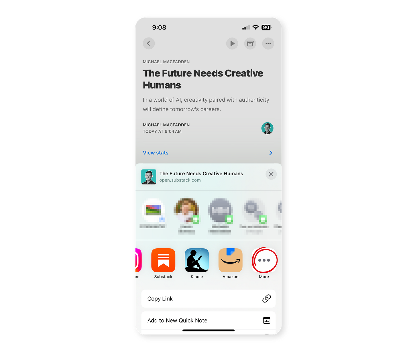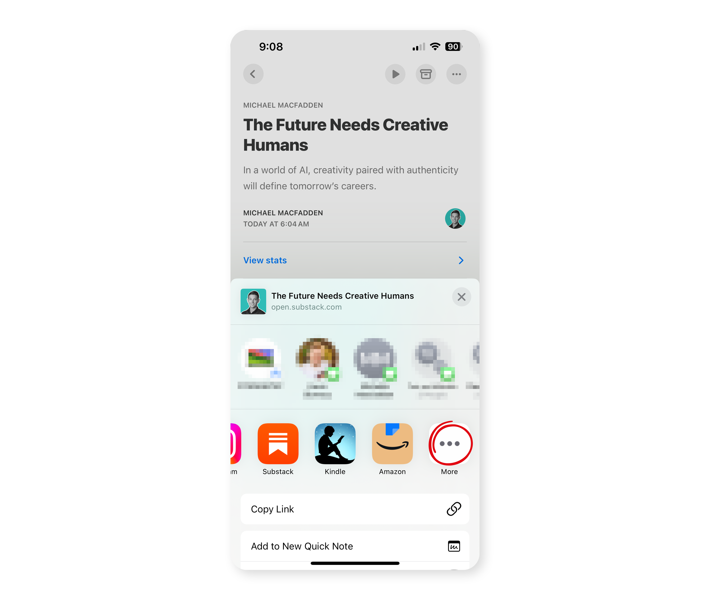 In the Substack app, find an article you’d like to read on kindle, scroll to the bottom, and click the share button.