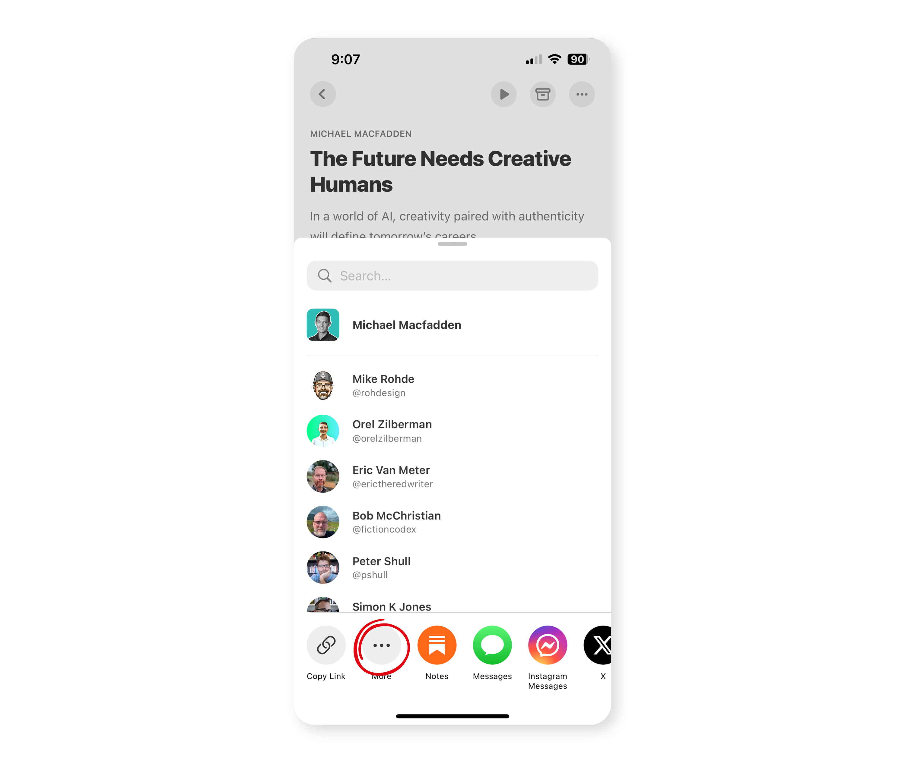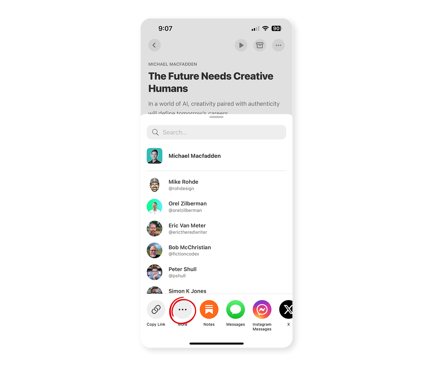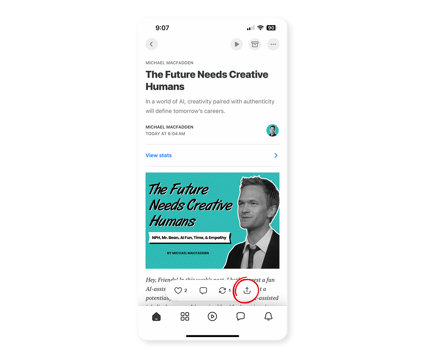In the Substack app, find an article you’d like to read on kindle, scroll to the bottom, and click the share button.