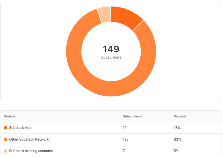 Diving in a little deeper, I can see that some of my growth came from the Substack app itself—about 150 subscribers. Presumably, this is a product of the black box that is their recommendation algorithm.